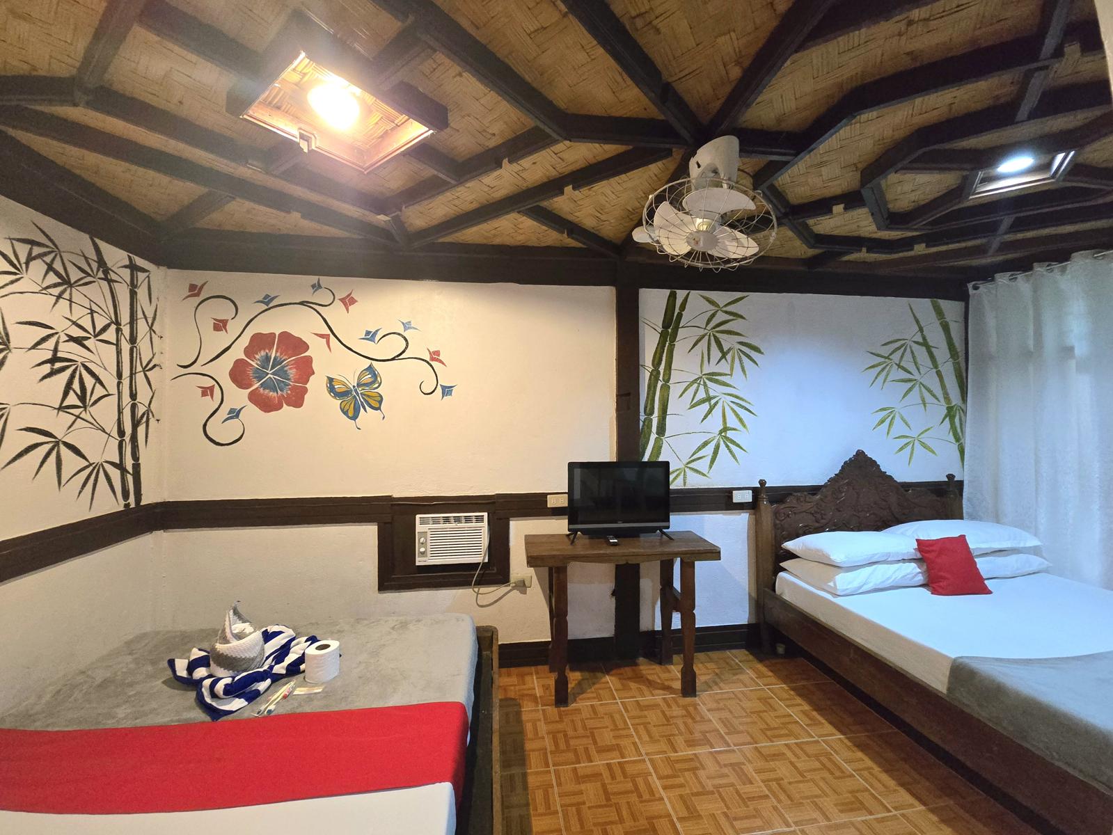 Spacious family room surrounded by lush gardens, featuring a private balcony with relaxing outdoor views. Perfect for families or small groups. Includes air-conditioning, hot & cold shower, cable TV, and daily breakfast for guests.